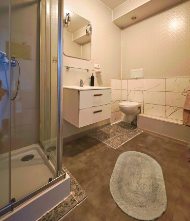 Apartament Pomarańczowy nr 5 składa się z przedpokoju wyposażonego w garderobę z lustrem. Po prawej stronie przedpokoju znajduje się wejście do obs...